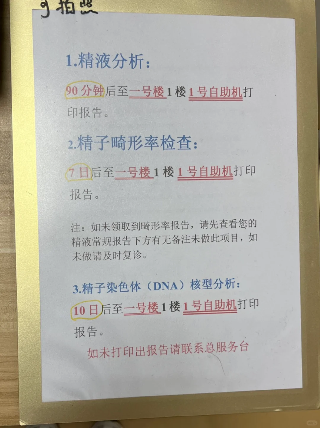 最后,取好jy后,拿给511室,医生会提醒90分钟出jy正常检查报告,7天内畸形率报告,10天内出DNA核型分析。