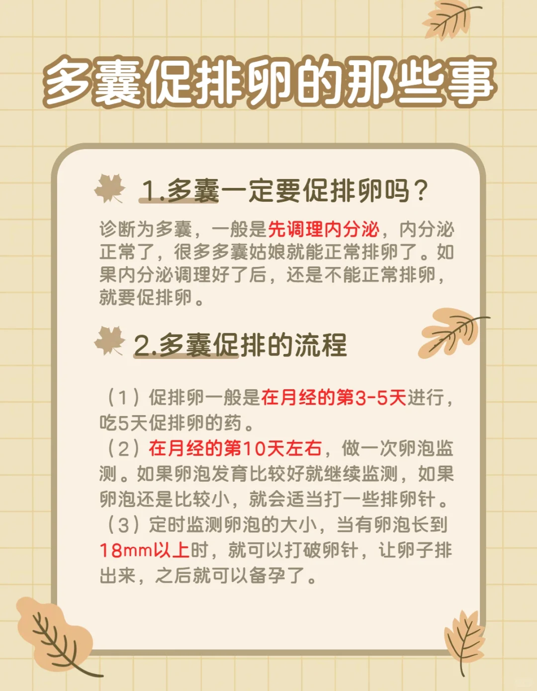 (3)定时监测卵泡的大小,当有卵泡长到18mm以上时,就可以打破卵针,让卵子排出来,之后就可以备孕了。 #多囊 #多囊备孕 #多囊促排